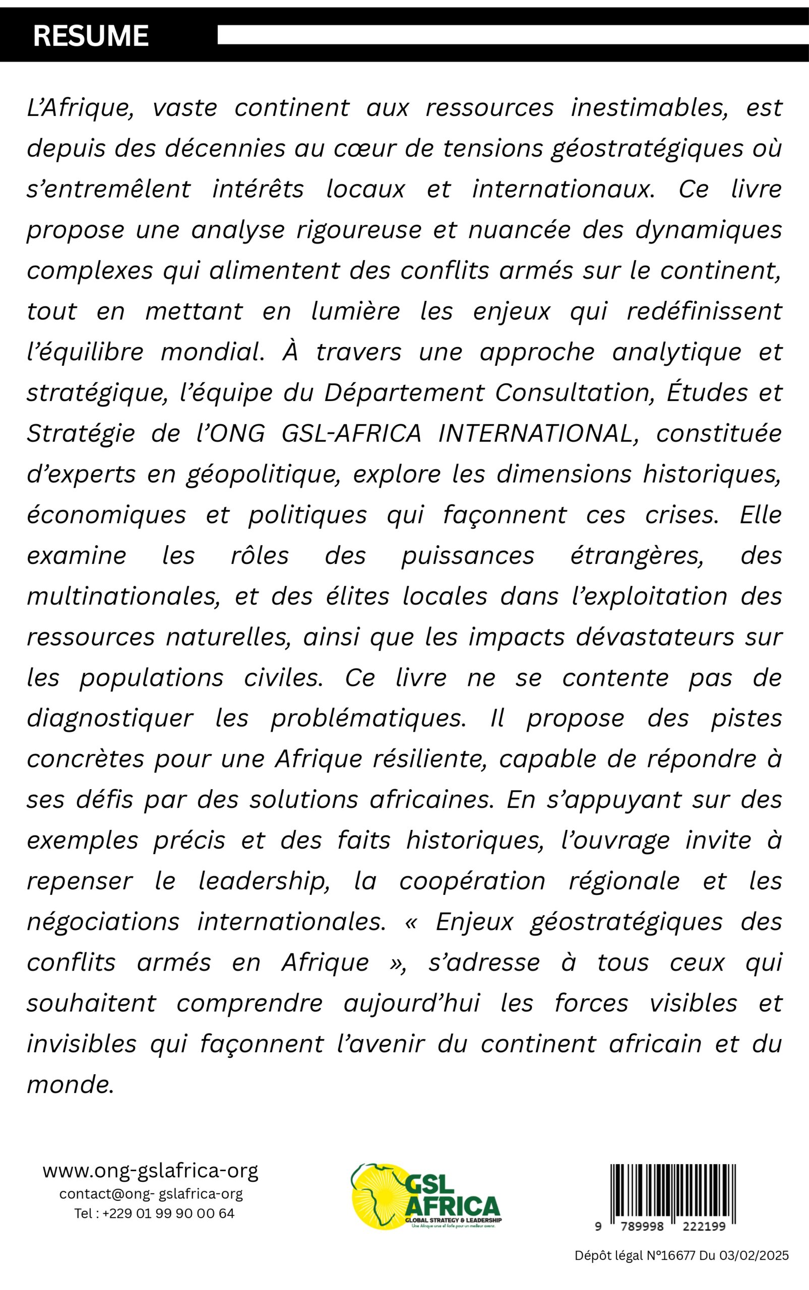 L’Afrique, vaste continent aux ressources inestimables, est depuis des décennies au coeur de tensions géostratégiques où s’entremêlent intérêts locaux et internationaux. Ce livre propose une analyse rigoureuse et nuancée des dynamiques complexes qui alimentent des conflits armés sur le continent, tout en mettant en lumière les enjeux qui redéfinissent l’équilibre mondial. À travers une approche analytique et stratégique, l’équipe du Département Consultation, Études et Stratégie de l’ONG GSL-AFRICA INTERNATIONAL, constituée d’experts en géopolitique, explore les dimensions historiques, économiques et politiques qui façonnent ces crises. Elle examine les rôles des puissances étrangères, des multinationales, et des élites locales dans l’exploitation des ressources naturelles, ainsi que les impacts dévastateurs sur les populations civiles. Ce livre ne se contente pas de diagnostiquer les problématiques. Il propose des pistes concrètes pour une Afrique résiliente, capable de répondre à ses défis par des solutions africaines. En s’appuyant sur des exemples précis et des faits historiques, l’ouvrage invite à repenser le leadership, la coopération régionale et les négociations internationales. « Enjeux géostratégiques des conflits armés en Afrique », s’adresse à tous ceux qui souhaitent comprendre aujourd’hui les forces visibles et invisibles qui façonnent l’avenir du continent africain et du monde.