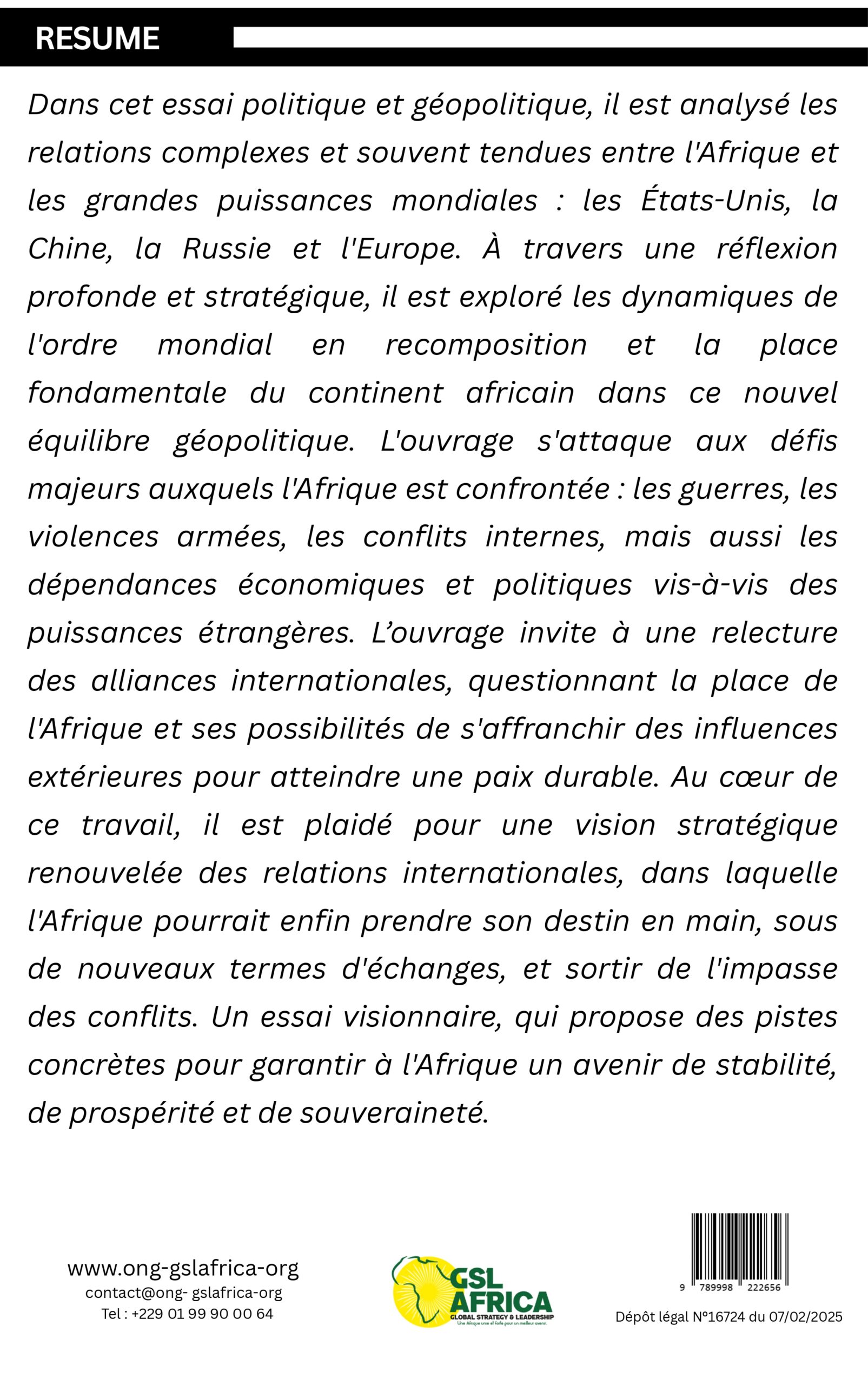 travers une réflexion profonde et stratégique, il est exploré les dynamiques de l’ordre mondial en recomposition et la place fondamentale du continent africain dans ce nouvel équilibre géopolitique. L’ouvrage s’attaque aux défis majeurs auxquels l’Afrique est confrontée : les guerres, les violences armées, les conflits internes, mais aussi les dépendances économiques et politiques vis-à-vis des puissances étrangères. L’ouvrage invite à une relecture des alliances internationales, questionnant la place de l’Afrique et ses possibilités de s’affranchir des influences extérieures pour atteindre une paix durable. Au coeur de ce travail, il est plaidé pour une vision stratégique renouvelée des relations internationales, dans laquelle l’Afrique pourrait enfin prendre son destin en main, sous de nouveaux termes d’échanges, et sortir de l’impasse des conflits. Un essai visionnaire, qui propose des pistes concrètes pour garantir à l’Afrique un avenir de stabilité, de prospérité et de souveraineté.